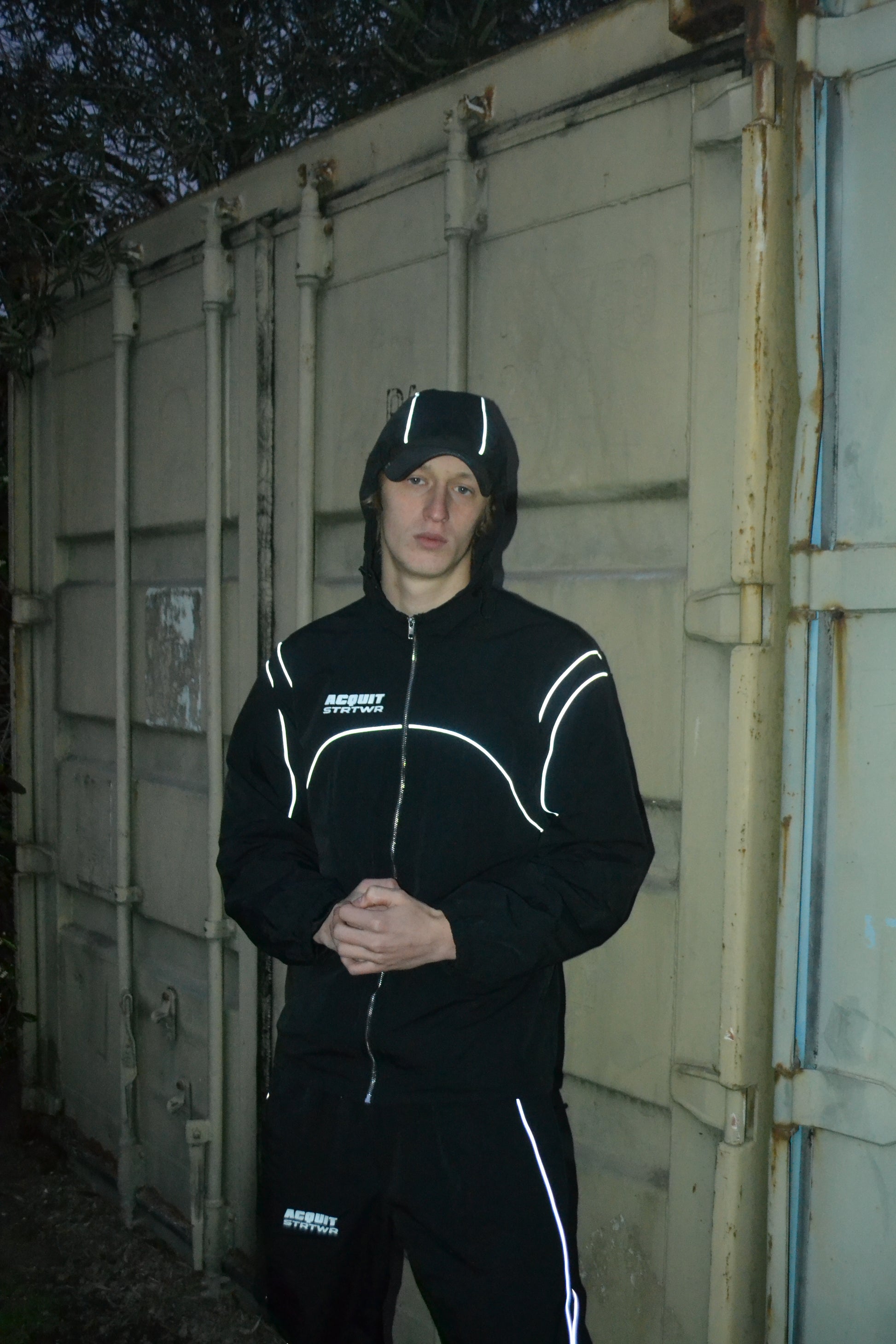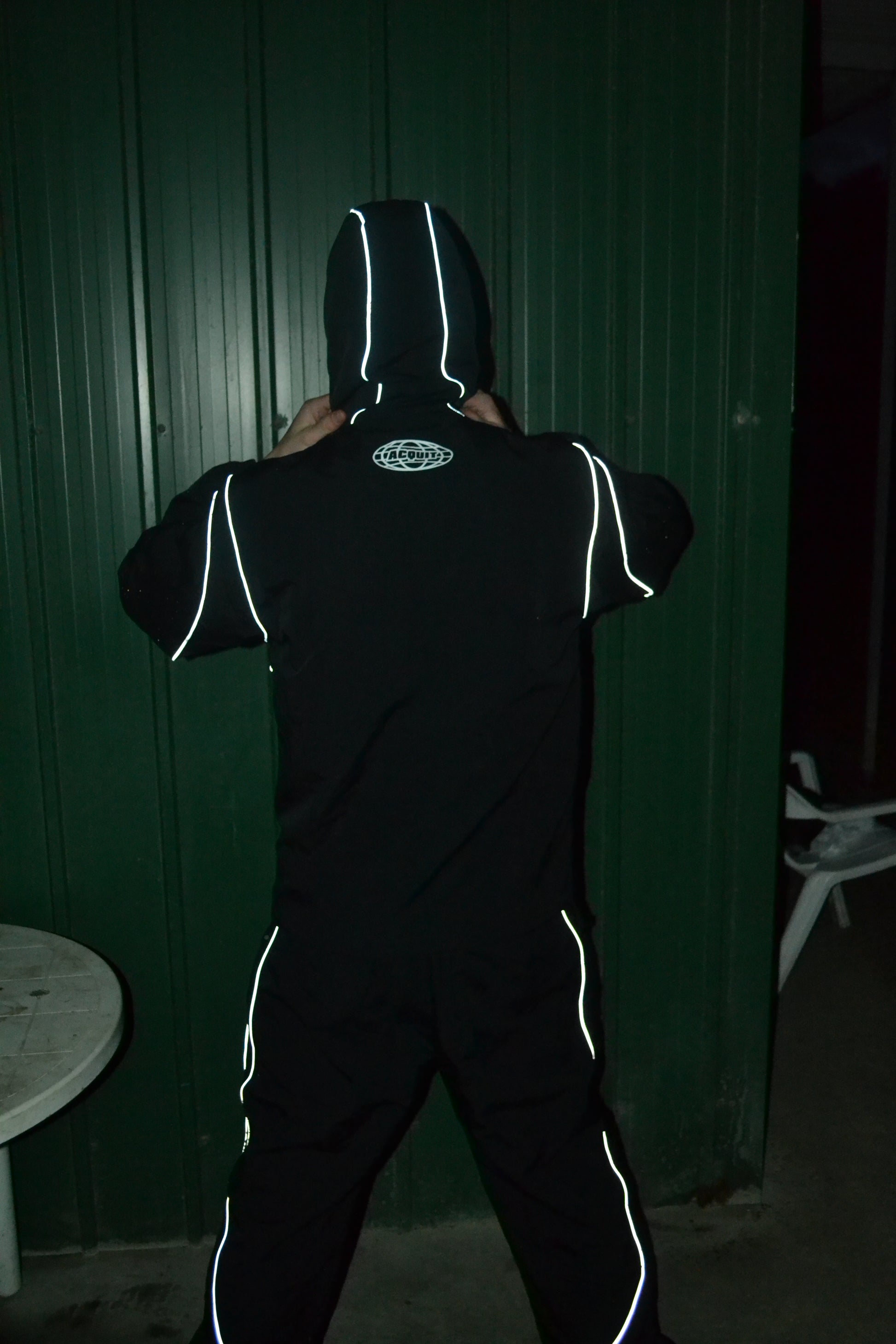 Fitted with zips, waist drawstrings and hood drawstrings.